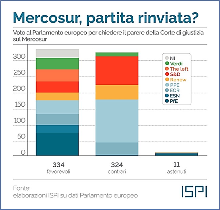 L’accordo incontra ancora una forte opposizione, soprattutto in Francia e dal settore agricolo. Con uno stupefacente moto di resistenza passivo-aggressiva, il Parlamento europeo ha chiesto un parere giuridico alla Corte europea di Giustizia. Viene rimandato il benestare definitivo, visto che di solito per pronunciarsi la Corte impiega almeno 18 mesi. Sono state dirimenti le defezioni di alcuni membri della coalizione tra Partito Popolare Europeo e Alleanza dei Socialisti e Democratici; ora la Commissione dovrà decidere se applicare il trattato in via provvisoria o attendere. Nel momento in cui scriviamo a Bruxelles si sta discutendo dell’approvazione provvisoria.