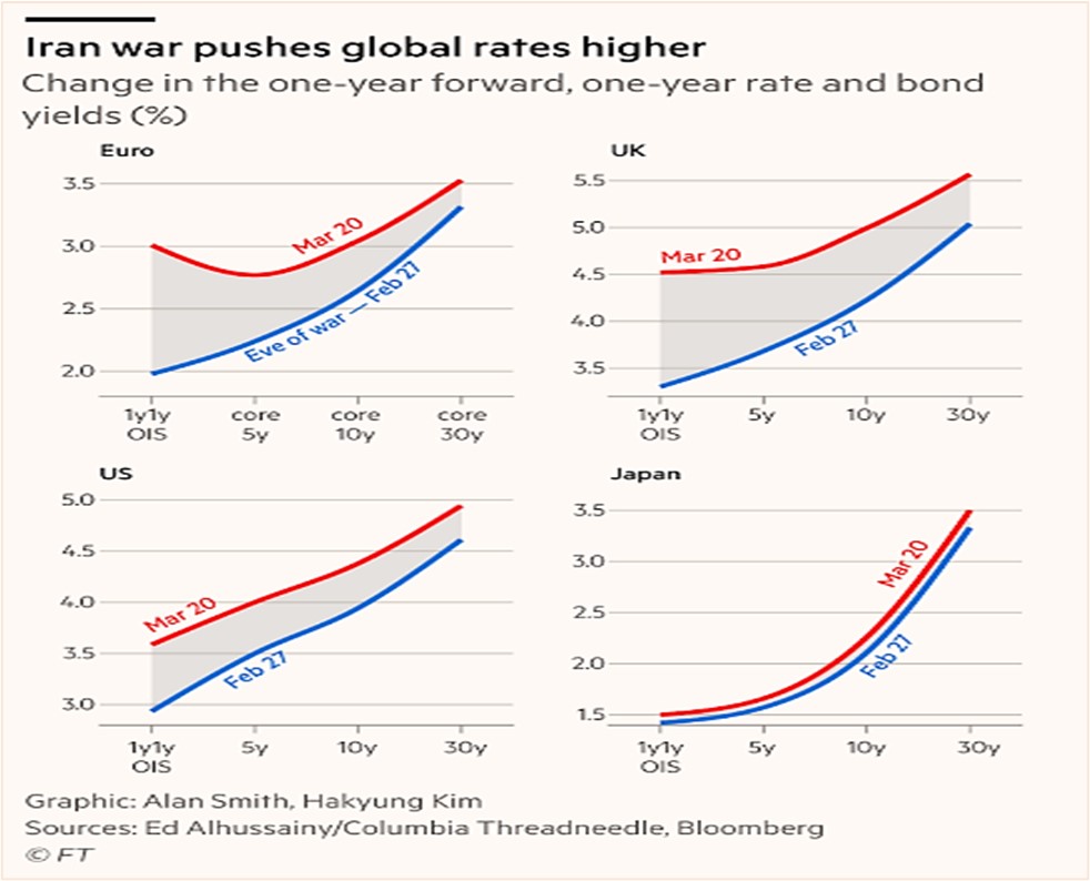 Di conseguenza gli analisti attribuiscono una bassa probabilità a tagli dei tassi nel futuro prossimo (giugno 2026). Anzi, i tassi di mercato sono in aumento in modo proporzionale alle aspettative di durata del conflitto.