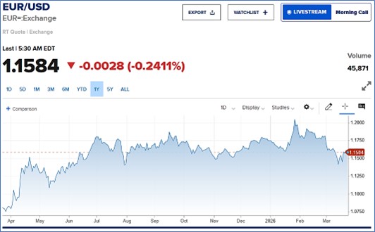 - Dollaro USA -8% rispetto ad un anno fa (da 1.07USD/1EUR a 1.16USD/1EUR).