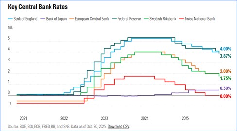 I tassi in Europa sono fermi dalla riunione BCE di giugno 2025. Alla riunione di ottobre sono stati lasciati al 2% (dal 4% del 2023) in attesa di osservazioni sul mercato del lavoro e sull’inflazione (obiettivo BCE: 2%). Se l’inflazione sale, i tassi vengono alzati per frenare i consumi.