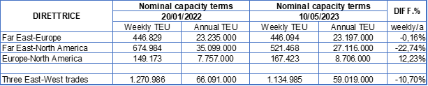 Le compagnie marittime che aderiscono alle tre alleanze, secondo le prime indiscrezioni della stampa specializzata, hanno già adottato dei provvedimenti di riduzione, sia della capacità di stiva in esercizio, sia della velocità media delle navi impiegate, a seconda dell’andamento del trade sulle singole direttrici, di seguito una sintetica tabella che riassume i dati della capacità nominale sulle direttrici East-West, raffrontando i valori di gennaio 2022 con quelli più recenti di maggio 2023, elaborata sulla base dei dati periodici diffusi da Alphaliner: