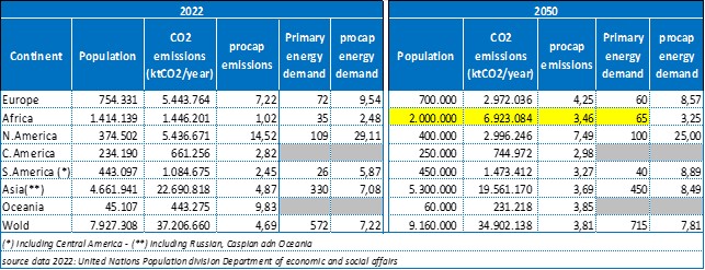 La richiesta energetica pro-capite è consequenziale e la produzione di CO2 pro-capite riteniamo non possa ridursi sotto una soglia fisiologica, anche tenuto conto che le proiezioni danno per scontato che gli idrocarburi saranno comunque ancora prevalenti, pur se in diminuzione come quota percentuale del totale di domanda (energia primaria).