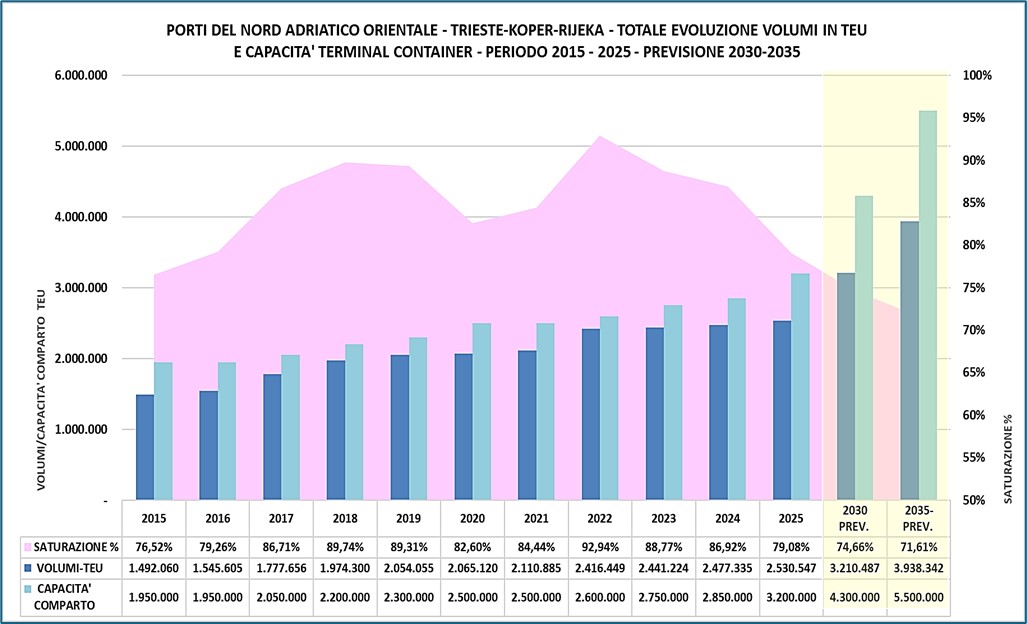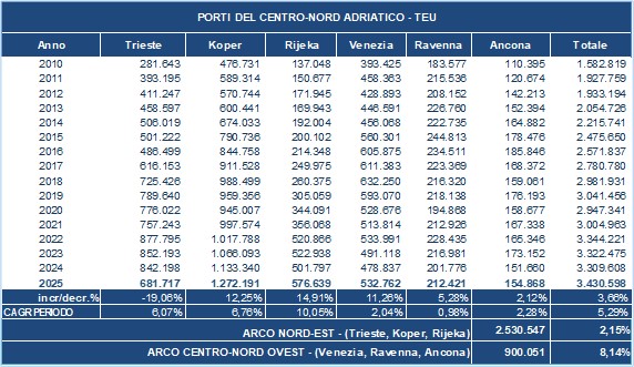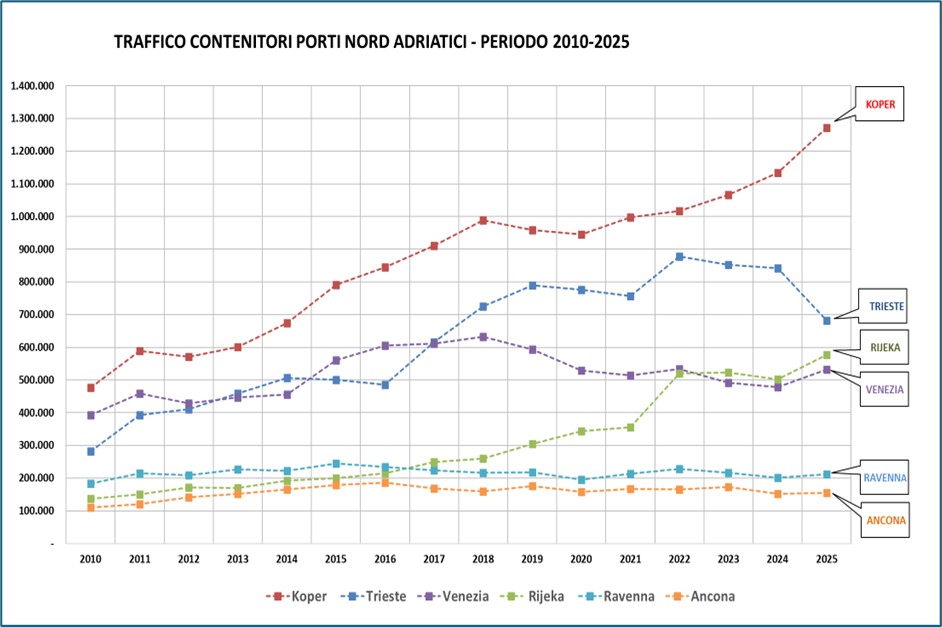 I tre porti di Venezia, Ravenna e Ancona hanno recuperato nel 2025 le perdite registrate nel precedente biennio causa appunto i dirottamenti verificatisi tra il 2023 e il 2024, mentre i tre porti del versante orientale presentano risultati diversificati, Koper e Rijeka hanno registrato incrementi rispettivamente del 12,25% e del 14,91%, mentre Trieste, come accennato sopra, causa la sospensione del servizio 2M ha sostanzialmente perduto i volumi in transhipment operati da Maersk pe Venezia, Ravenna e Ancona fino a marzo del 2025. Da notare che Rijeka conquista il terzo posto in graduatoria, superando Venezia e, con ogni probabilità, nel prossimo biennio ambirà a contendere con Trieste il secondo posto, pur presentando sotto l’aspetto logistico ancora delle rilevanti limitazioni nei collegamenti ferroviari con l’entroterra.